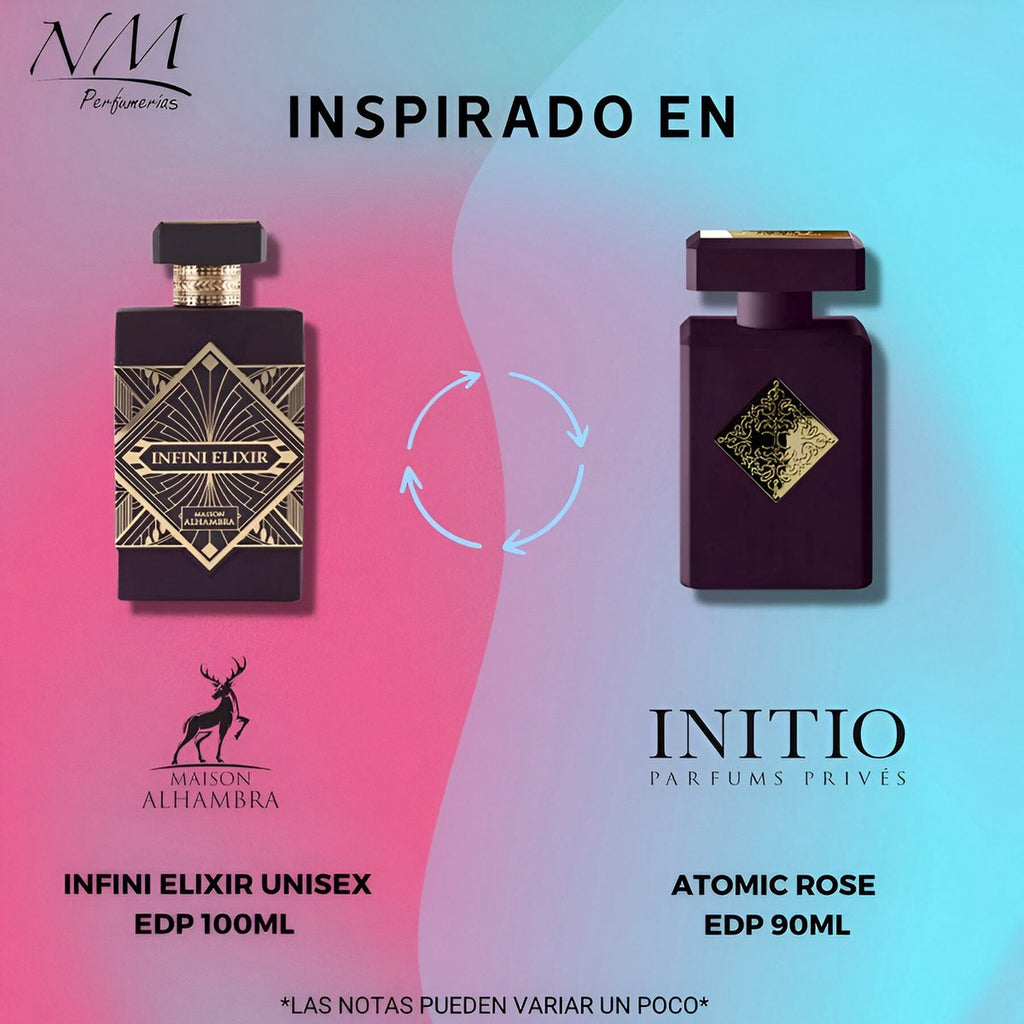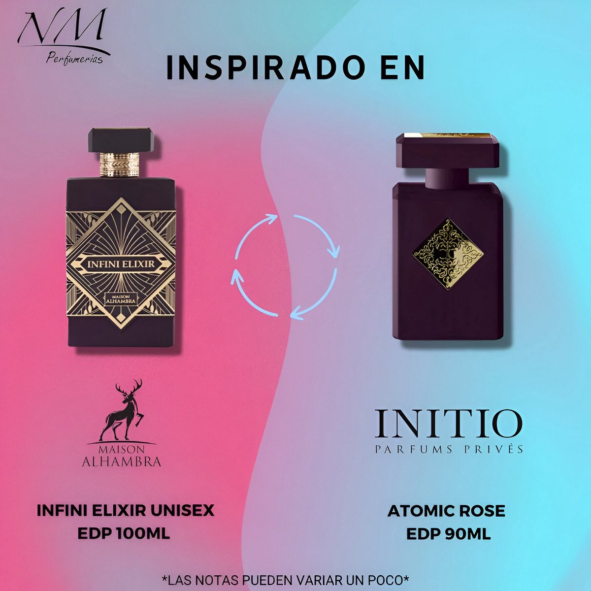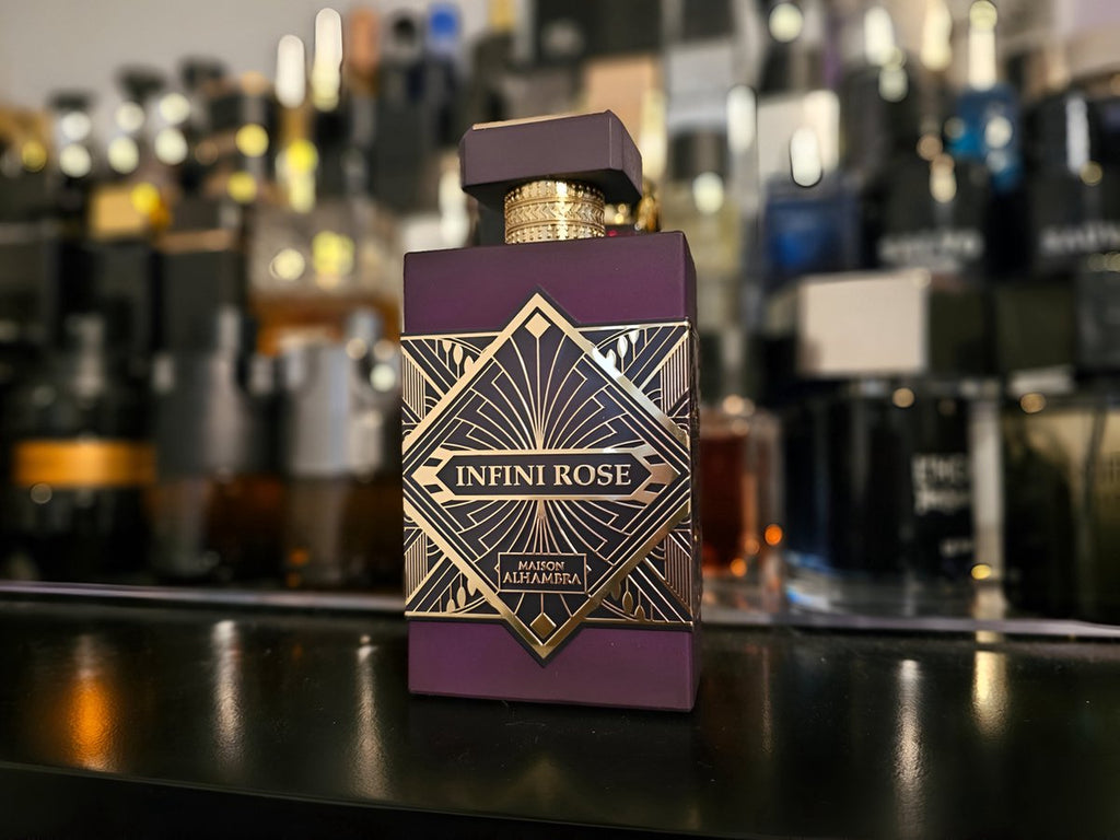 "Infini Elixer" van Maison Alhambra belooft een verfijnde en meeslepende geurervaring te bieden, geïnspireerd door de luxe en betovering van Initio Parfums Privés' "Atomic Rose".